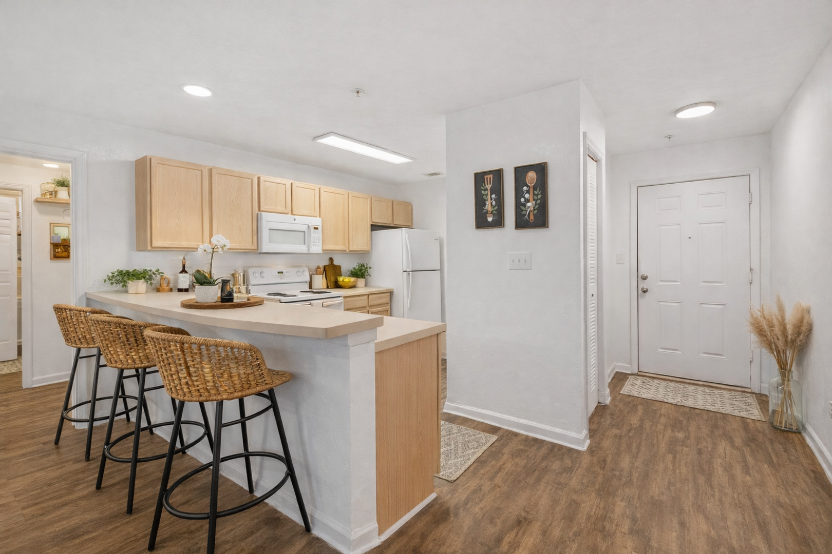 Residents also have access to resort-style amenities: a beach-style pool with hammocks, summer grill area, 24-hour fitness center, dog park, printing lab, and secure package lockers.