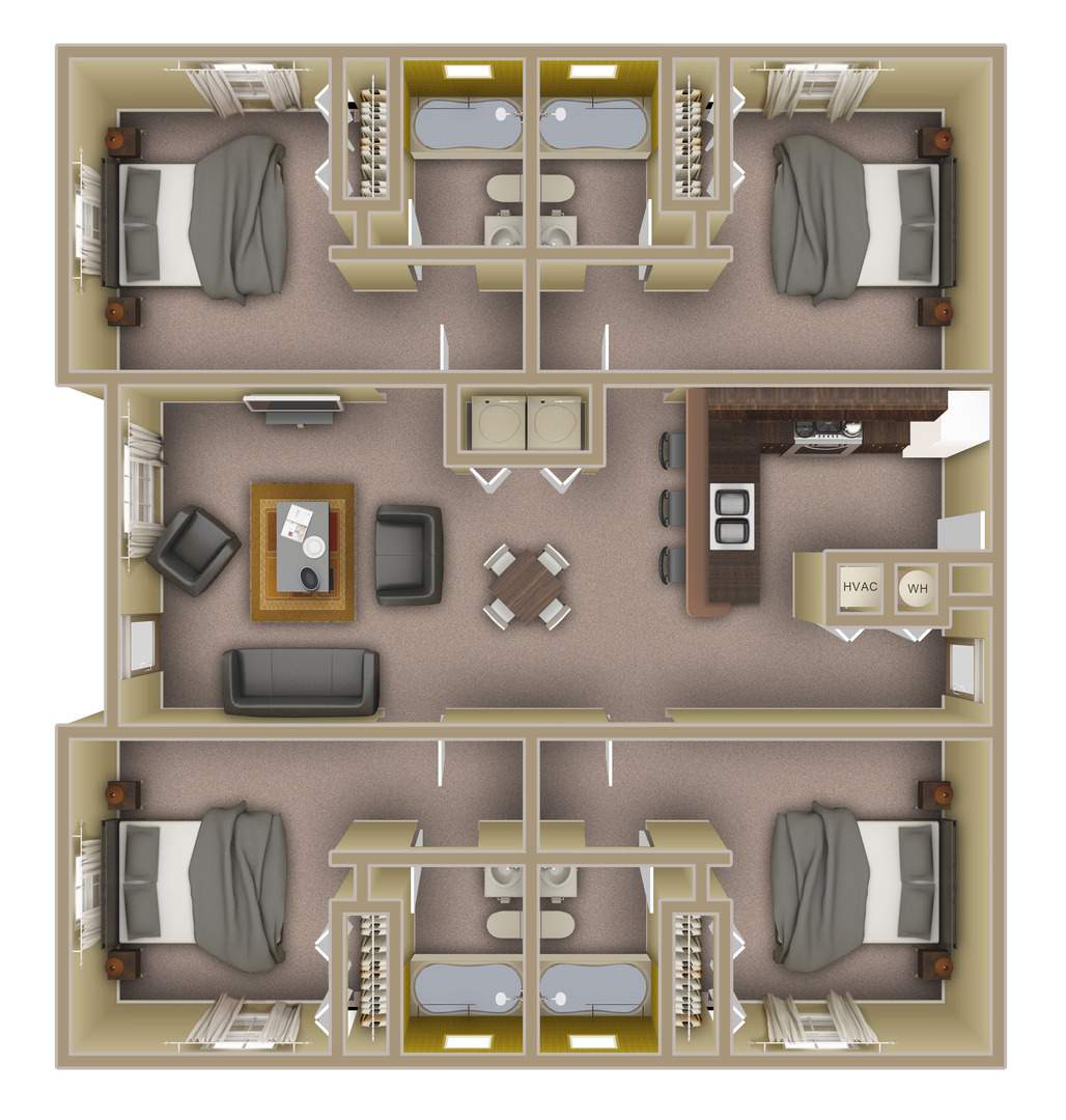 Live in the heart of the action at Villa Dylano, where our four-bedroom, four-bath Suite floorplans redefine upscale student living. Each oversized suite includes a private balcony, plus a mini fridge and microwave in every bedroom—perfect for convenience.